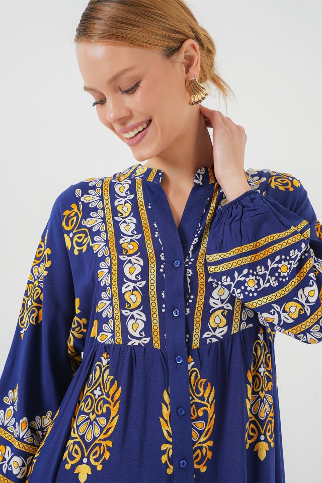 2423 Otantik Desenli Tesettür Elbise - Lacivert 6