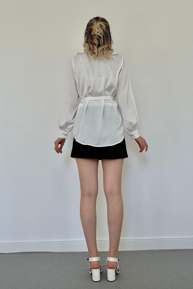 Beyaz Yakası Fırfırlı Kuşaklı Saten Gömlek