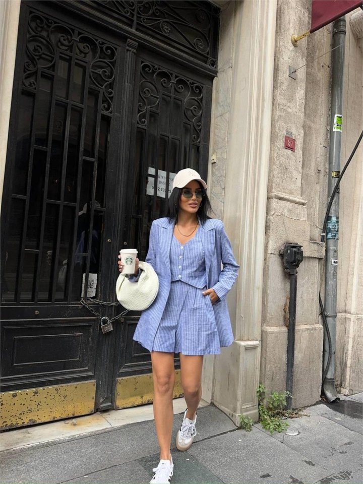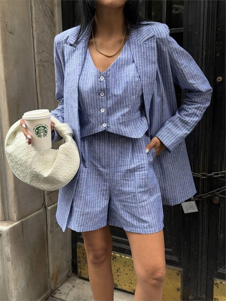 ÇİZGİLİ KETEN CEKET YELEK ŞORT TK - Mavi