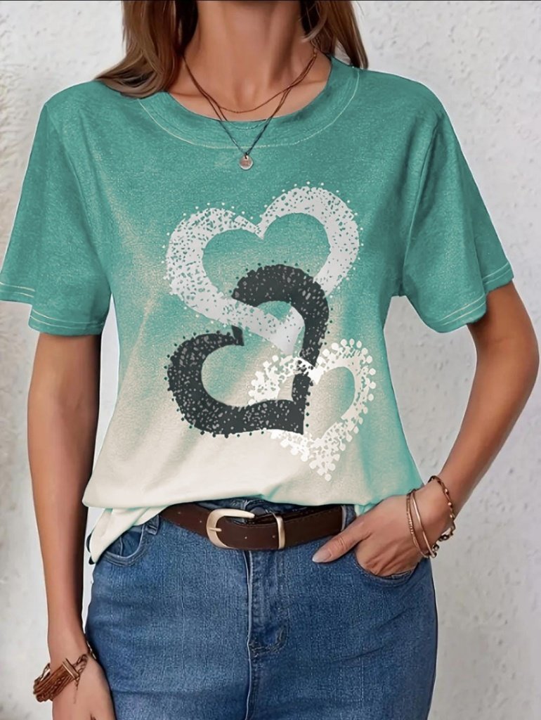 Kadın Kısa Kollu Bisiklet Yaka Kalp Baskılı Süprem Bluz