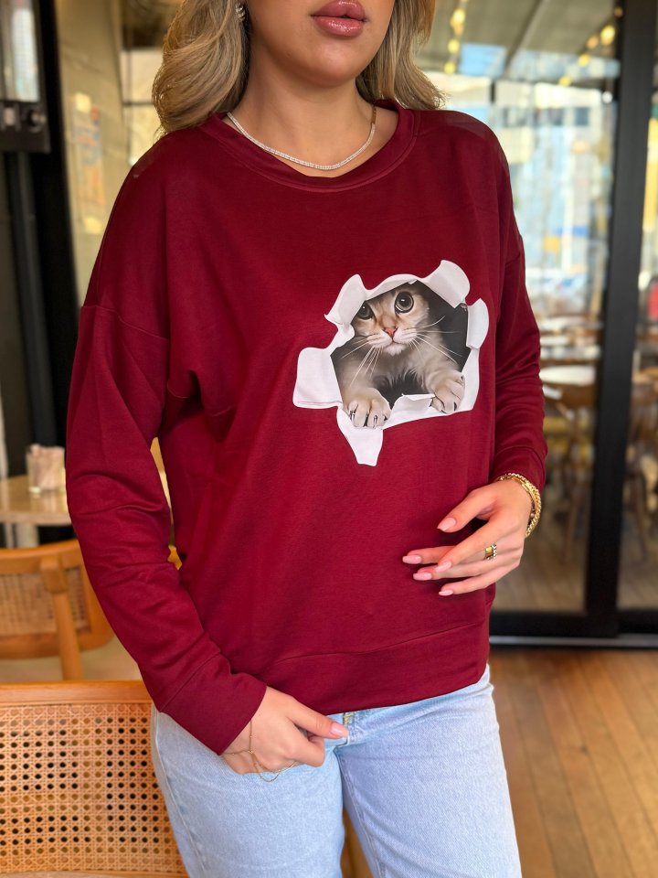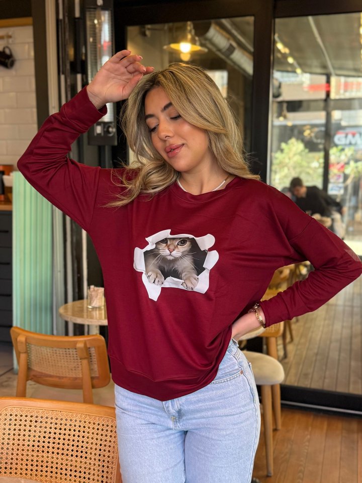 Kadın Uzun Kollu Bisiklet Yaka Kedi Desenli Viskon Iki Iplik Bluz