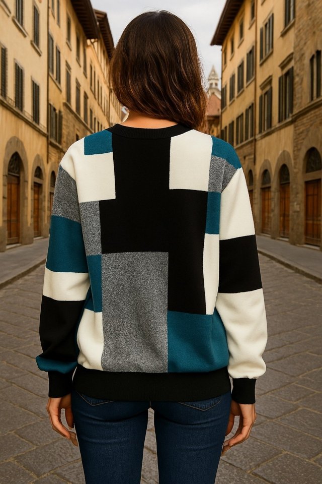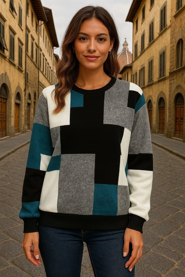 Kadın Uzun Kollu Bisiklet Yaka Renkli Blok Baskı Dalgıç Bluz