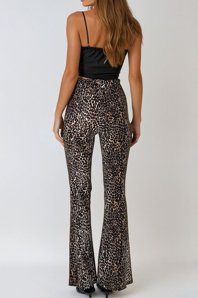 Kadın Yüksek Bel Ispanyol Paça Krep Kumaş Leopar Pantolon