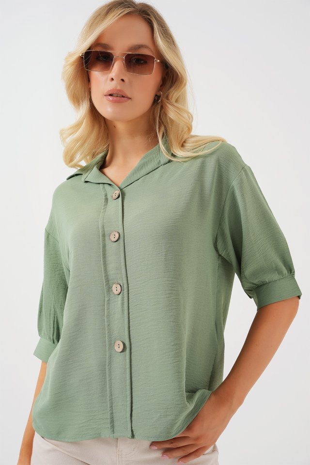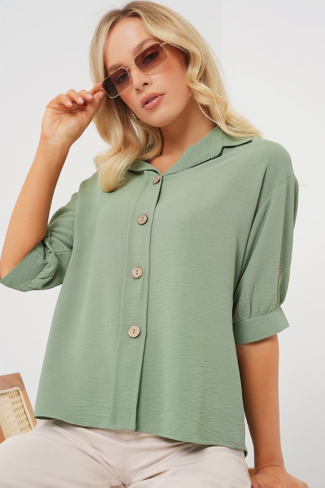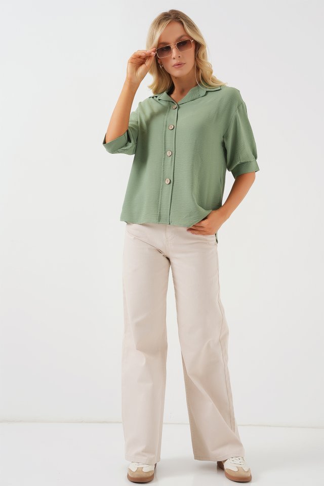 Kısa Kol Oversize Keten Gömlek 20240 - Çağla