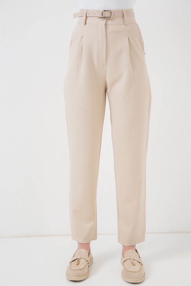 Pileli Kemerli Kumaş Pantolon 6725 - Krem