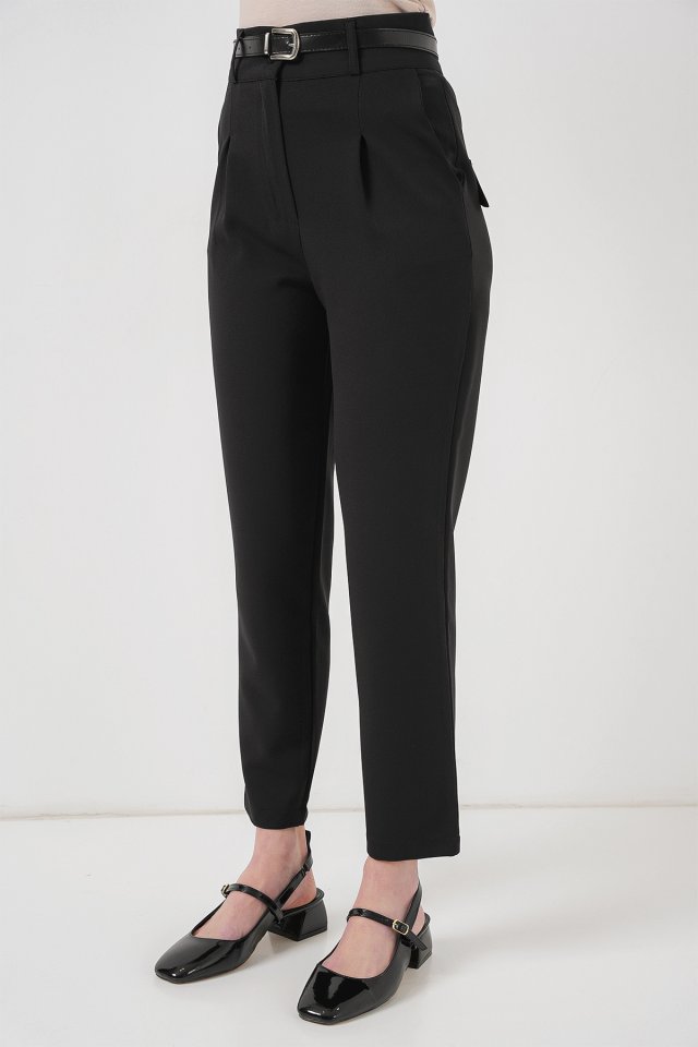 Pileli Kemerli Kumaş Pantolon 6725 - Siyah