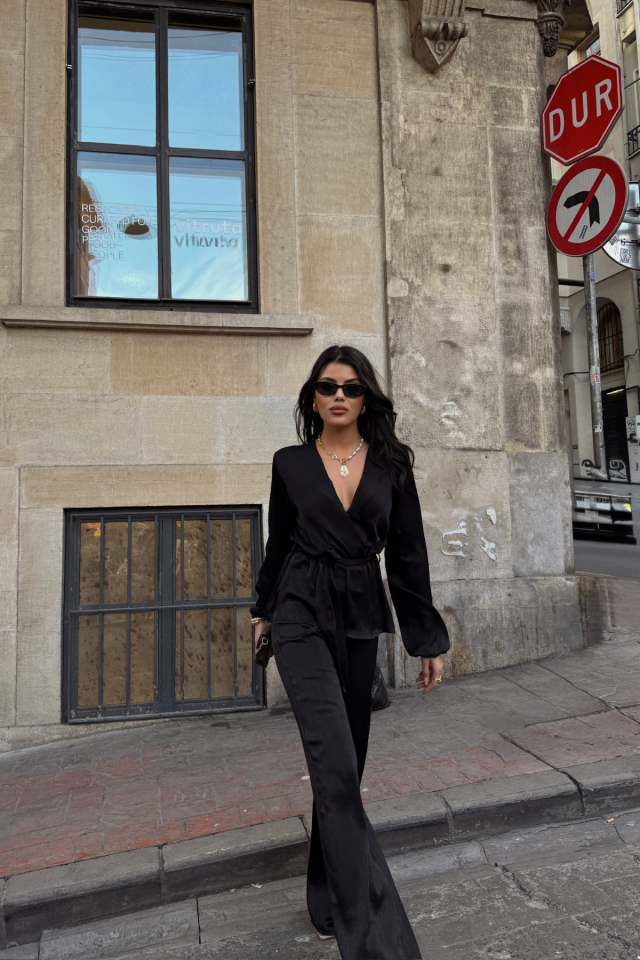 SATEN KRUVAZE BAĞLAMALI BLUZ- PANTOLON TAKIM - Siyah