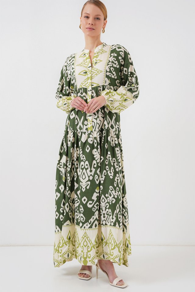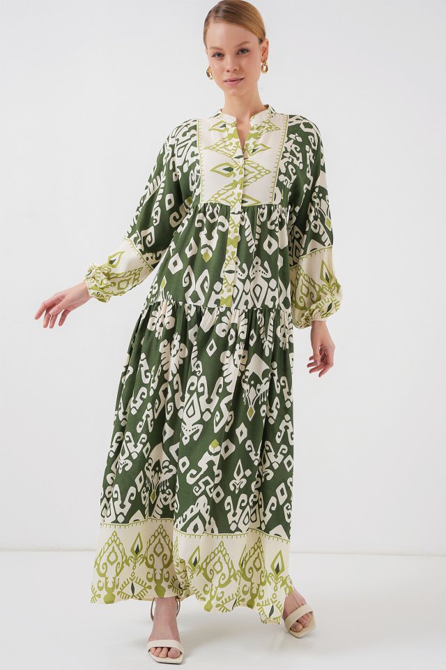 2423 Otantik Desenli Tesettür Elbise - B. Haki
