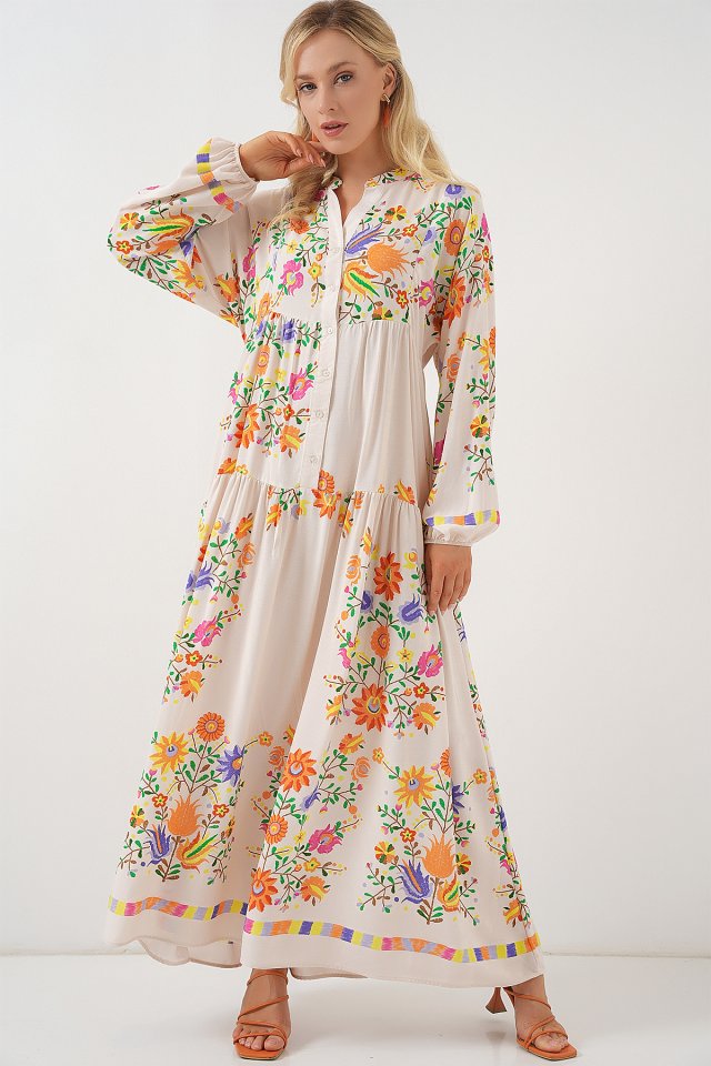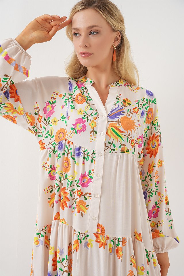 2423 Otantik Desenli Tesettür Elbise - B. Turuncu