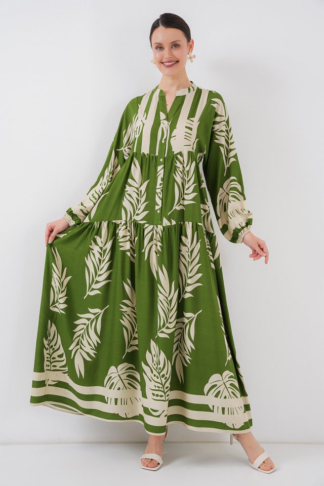 2423 Otantik Desenli Tesettür Elbise - Yeşil 5
