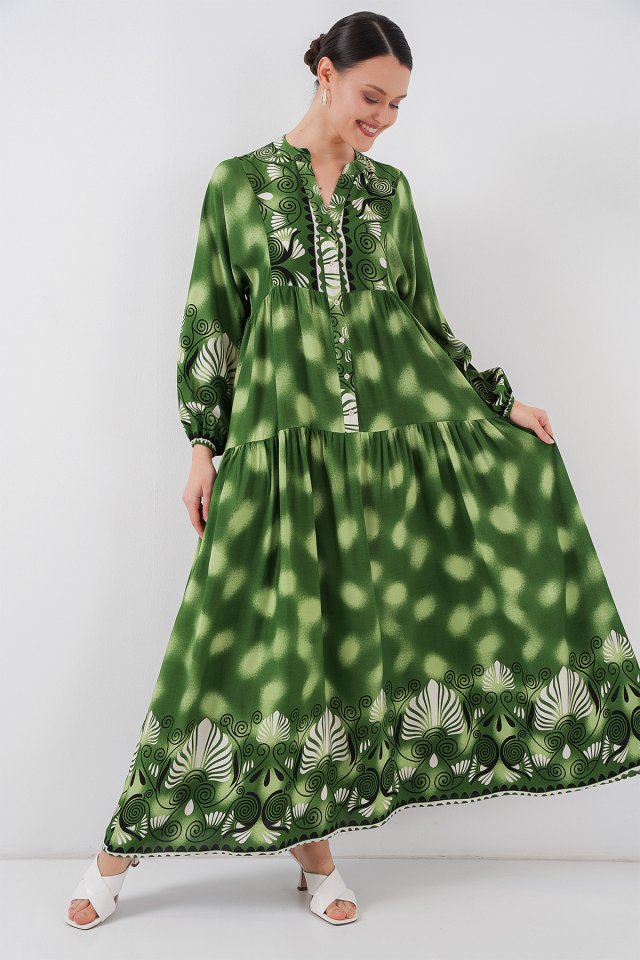 2423 Otantik Desenli Tesettür Elbise - Yeşil 6