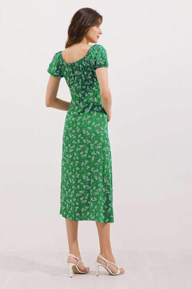 2427 Yırtmaçlı Çiçekli Viskon Elbise - Yeşil