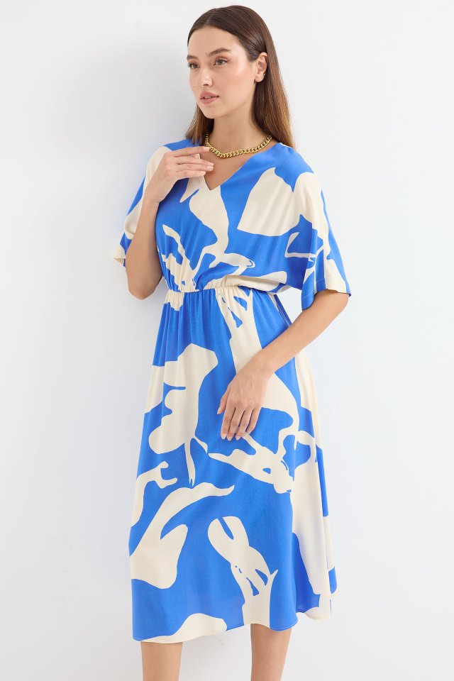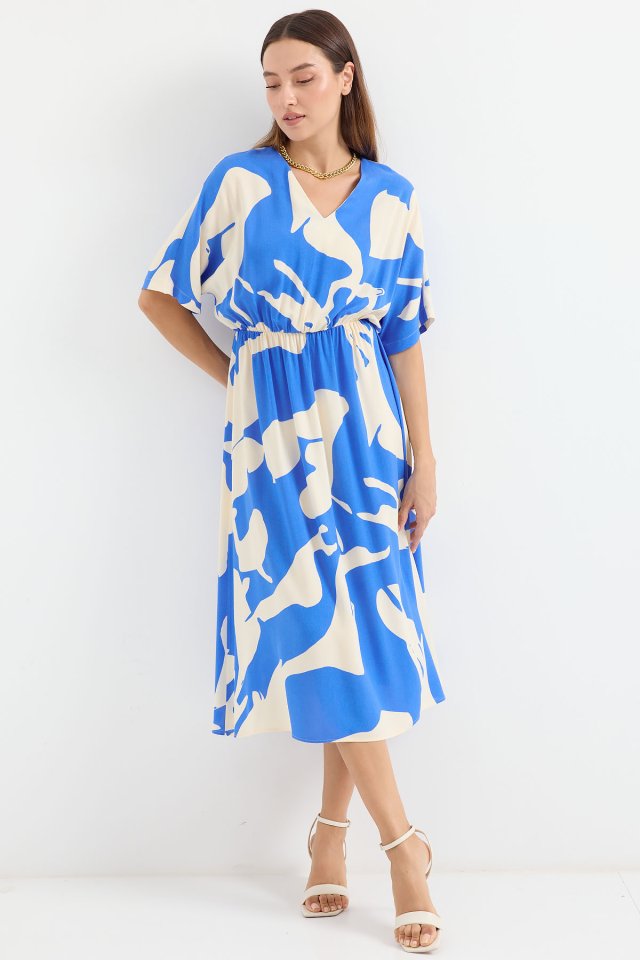 2511 Beli Lastikli Desenli Elbise - Mavi
