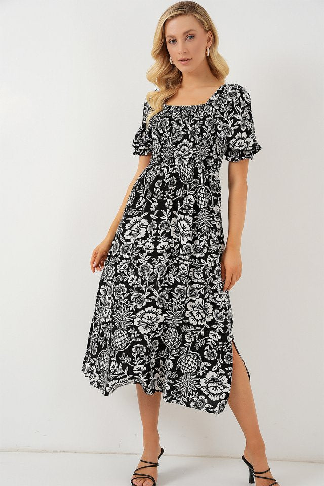 2512 Desenli Yırtmaçlı Elbise - D. Siyah