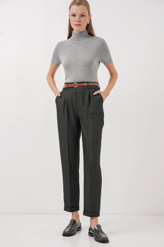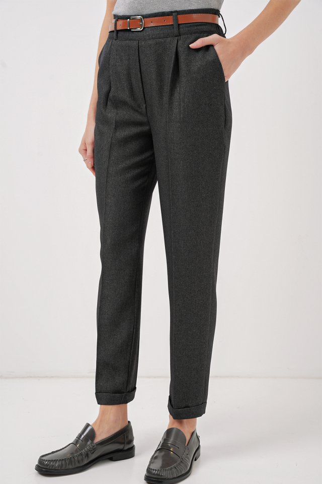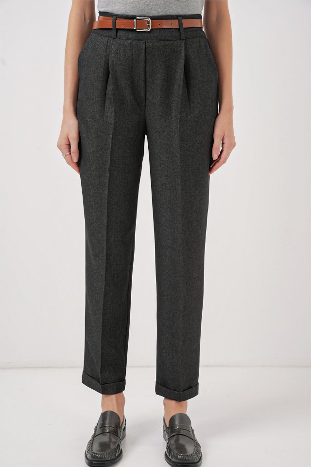 6686 Pileli Kemerli Kumaş Pantolon - Füme