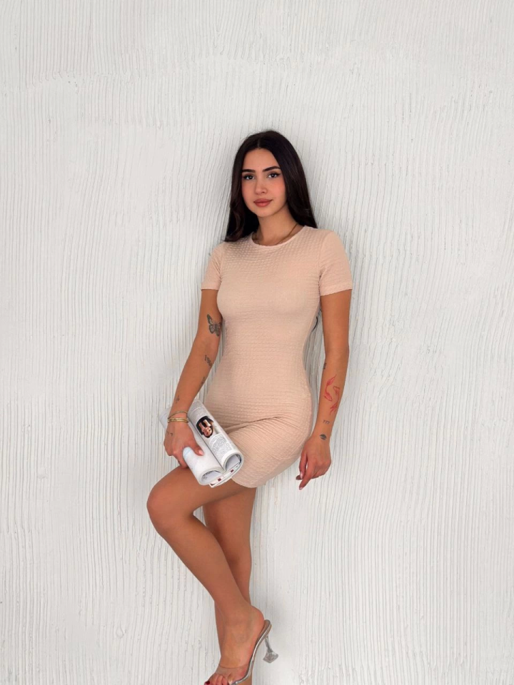 Bisiklet Yaka Kısa Kol Likralı Elbise - Bej