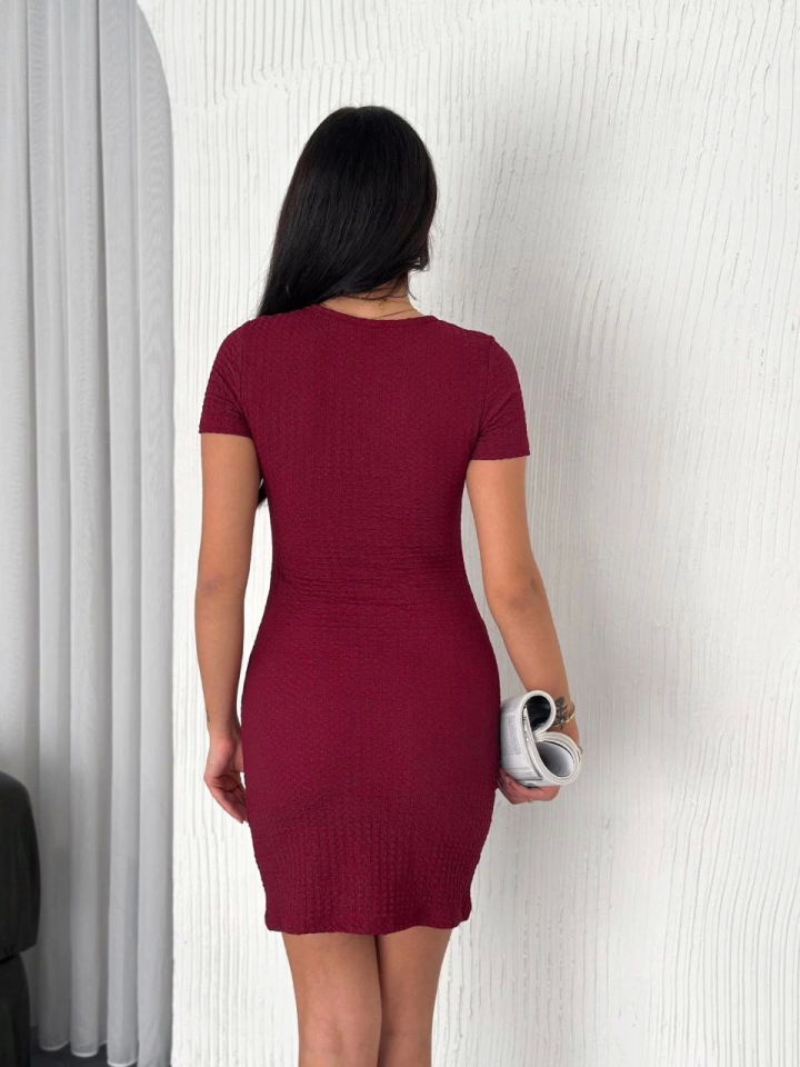 Bisiklet Yaka Kısa Kol Likralı Elbise - Bordo
