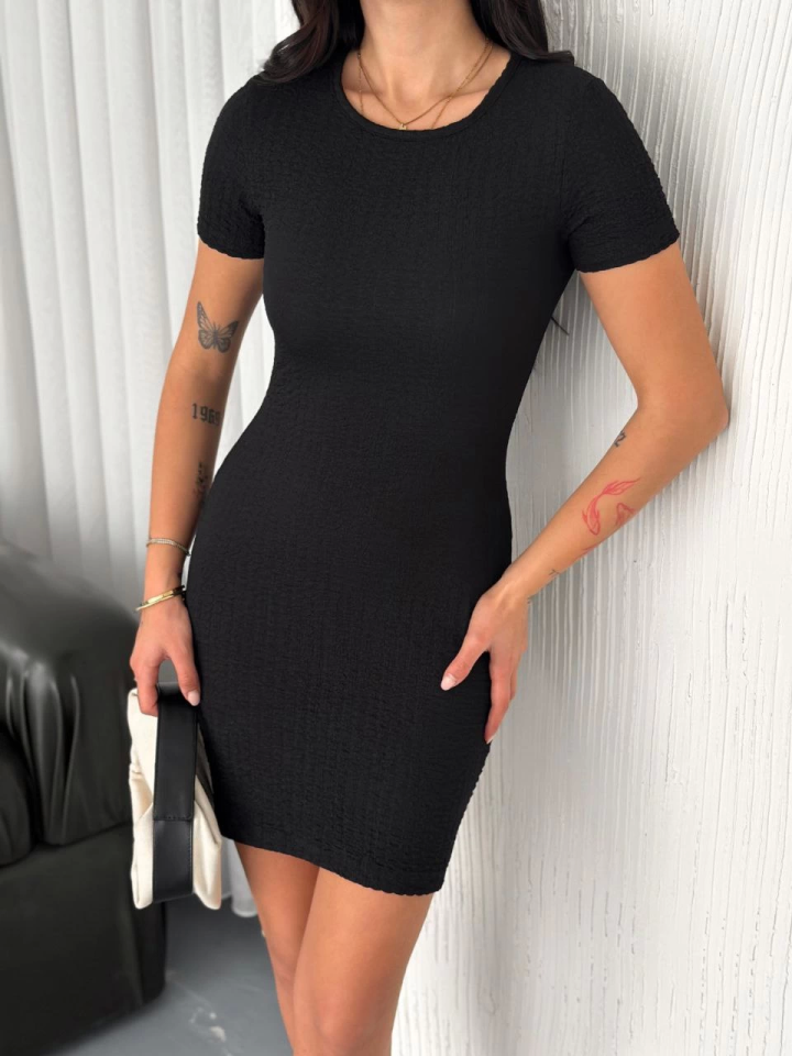 Bisiklet Yaka Kısa Kol Likralı Elbise - Siyah