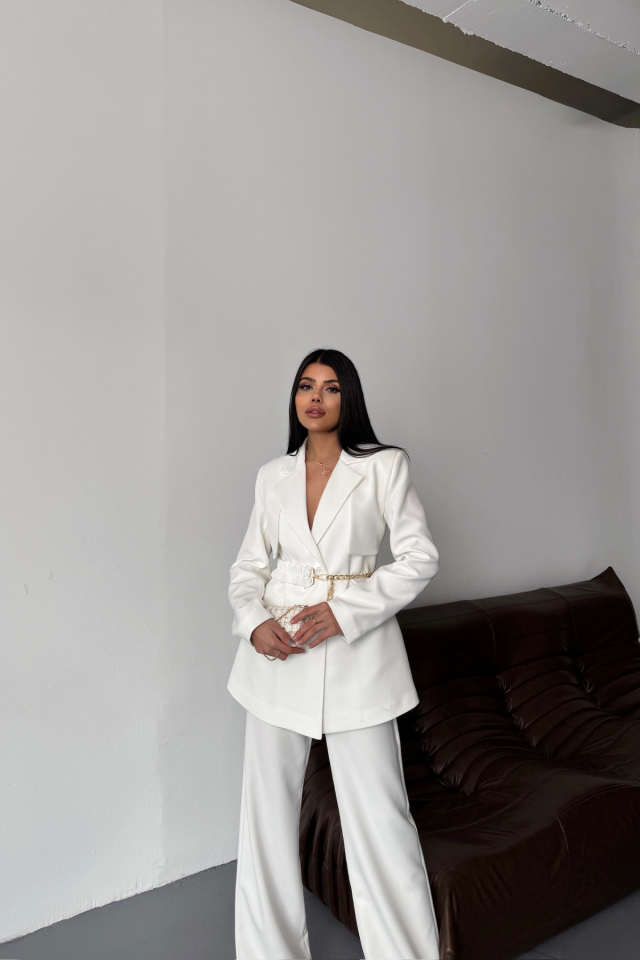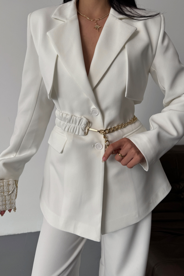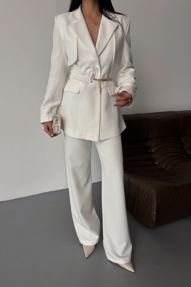 CEKET PANTOLON TAKIM TASARIM ZİNCİRKEMER DETAYLI - Beyaz
