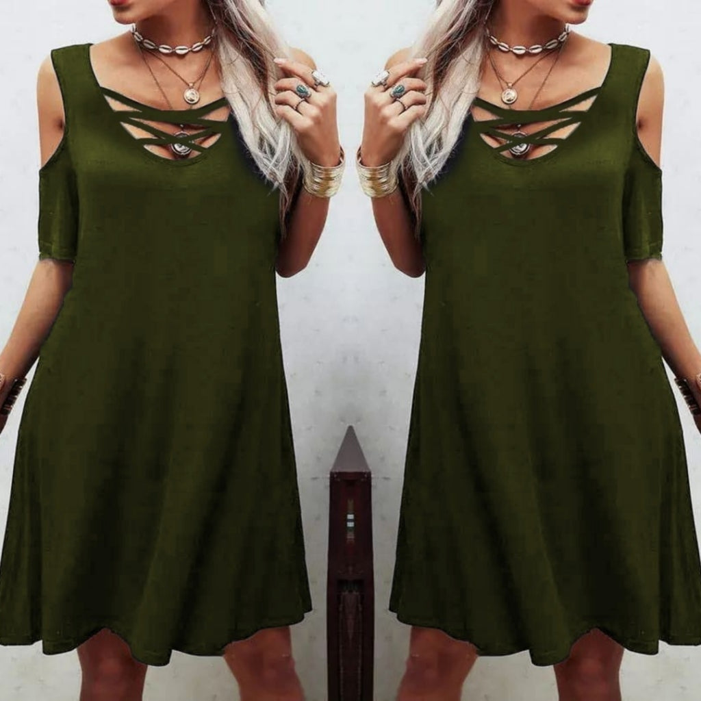 Dekolteli Bağcık Detay Viskon Kumaş Elbise