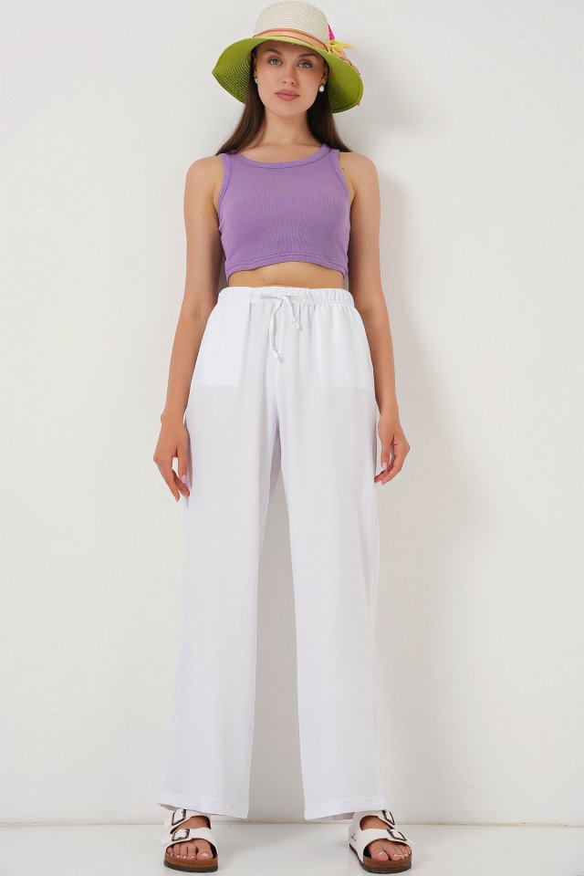 Geniş Paça Keten Pantolon 6735 - Beyaz