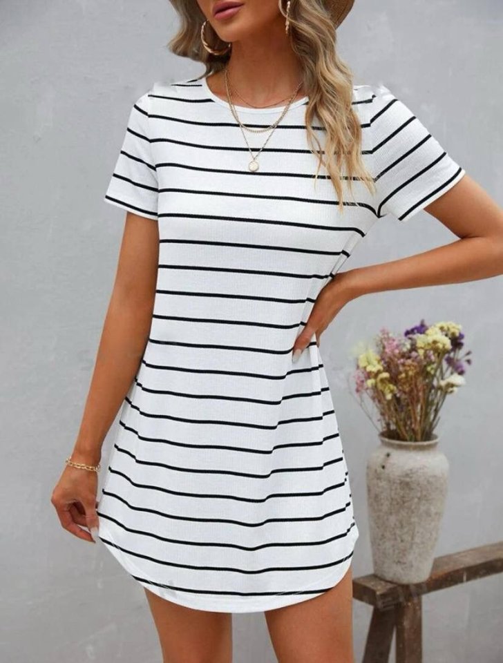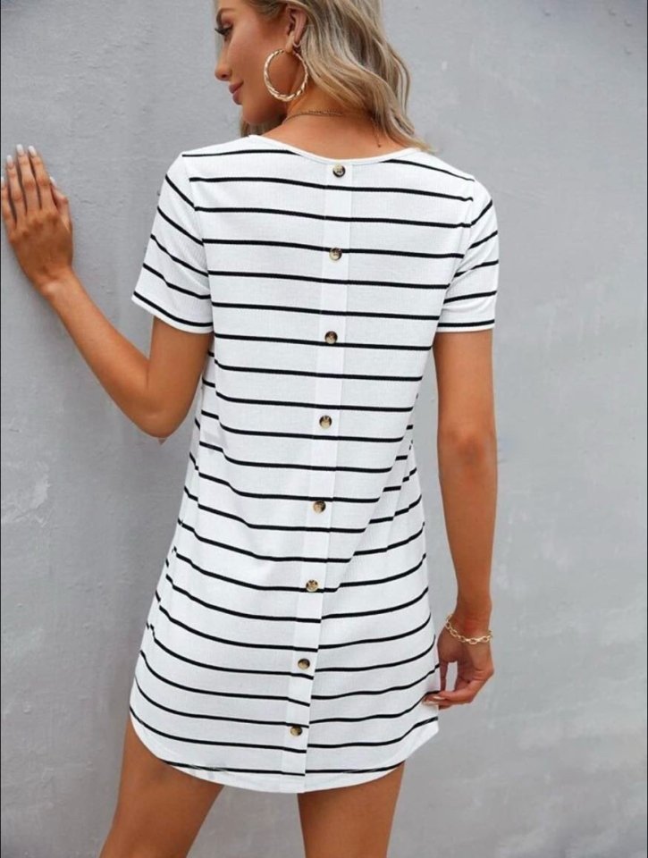Kadın Düğme Detaylı Bisiklet Yaka Çizgili Kaşkorse Elbise