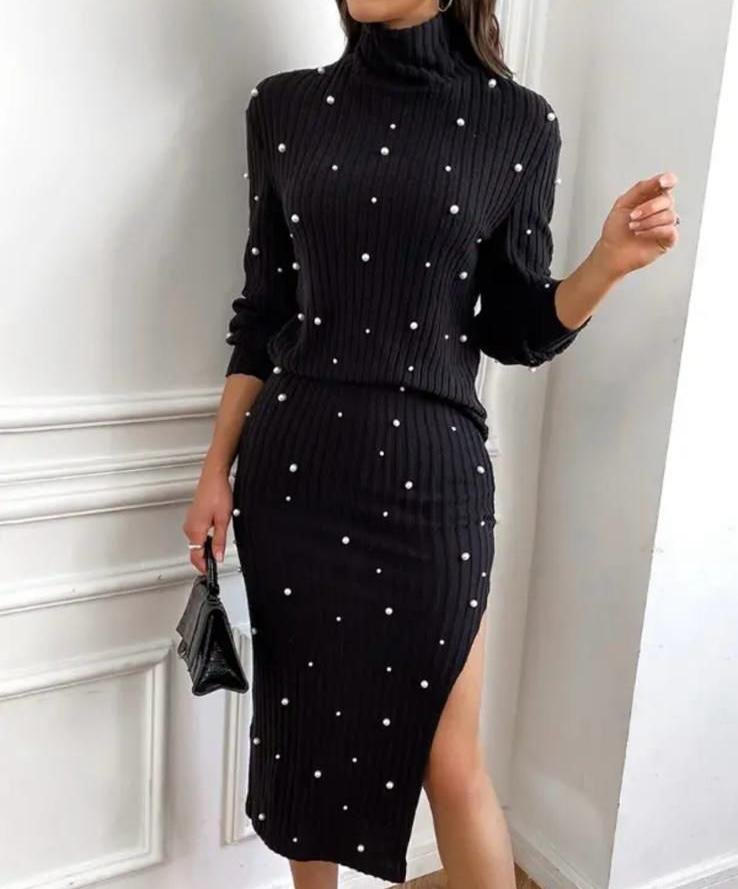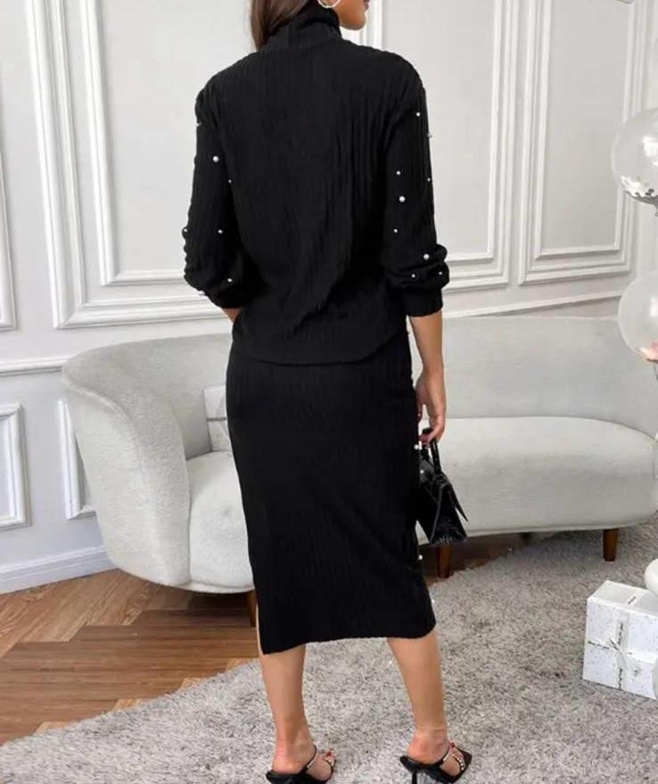 Kadın Eteği Yırtmaçlı Ottoman Kumaş Inci Detaylı Ikili Takım
