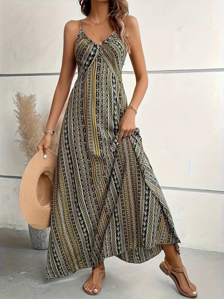 Kadın Ip Askılı Sırttan çapraz Detaylı Yırtmaçlı Desenli Süprem Elbise