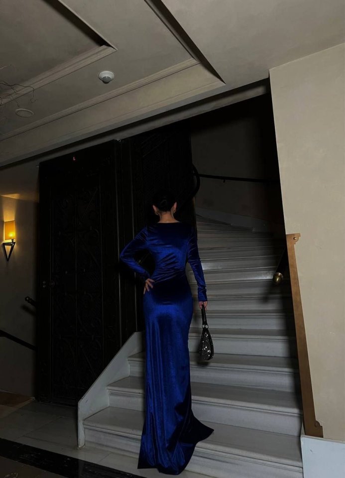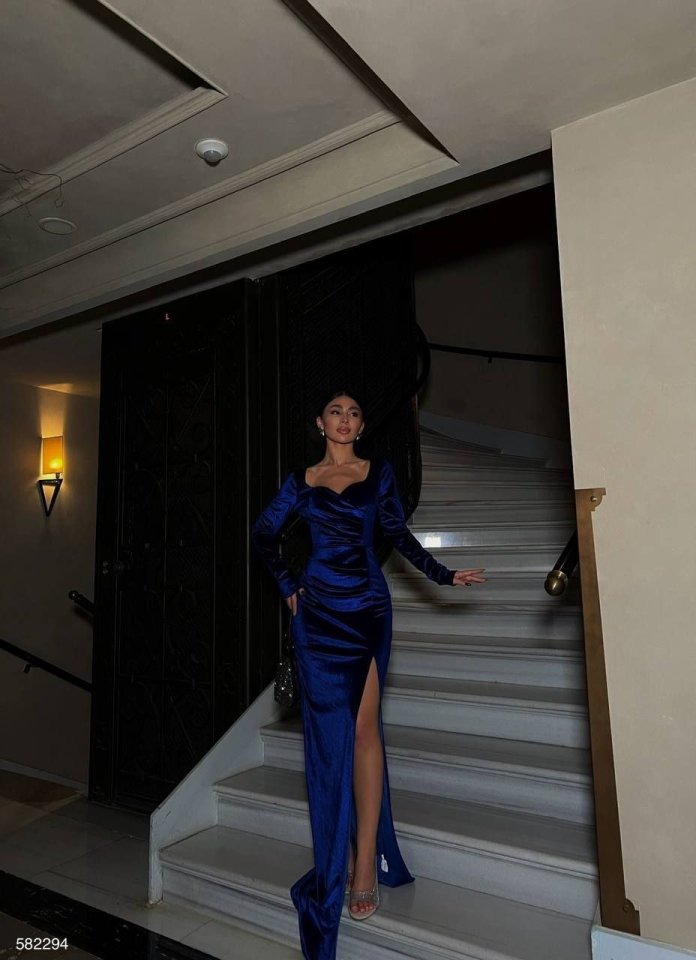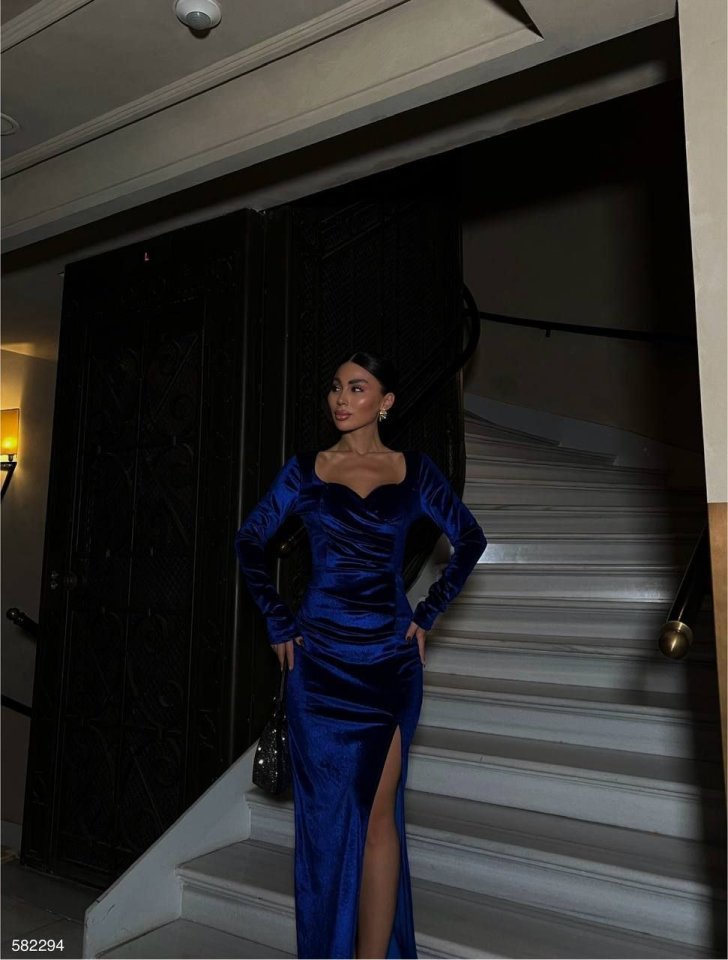 Kadın Kadife Kumaş Kalp Yaka Yırtmaç Detaylı Maxi Boy Elbise
