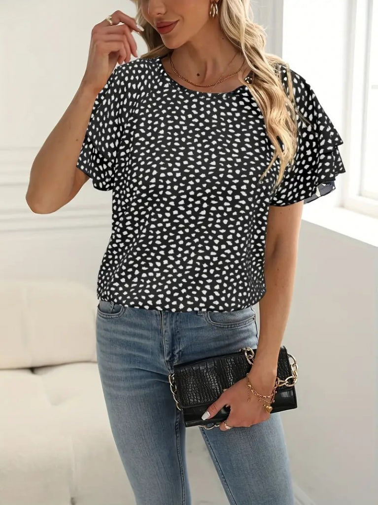 Kadın Kısa Kollu Kolları Volanlı Baskılı Süprem Bluz