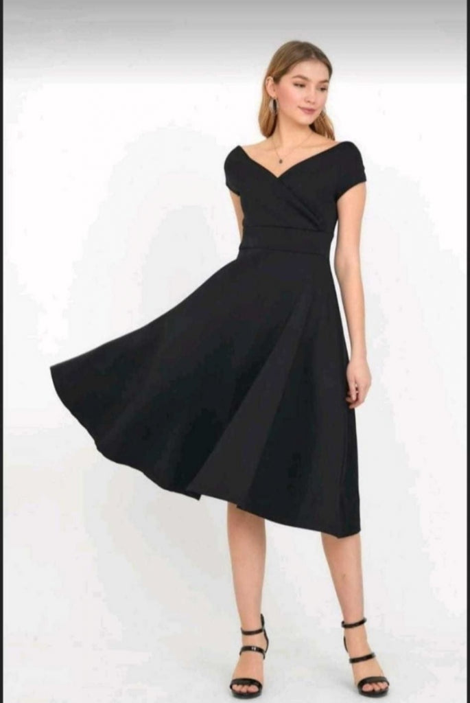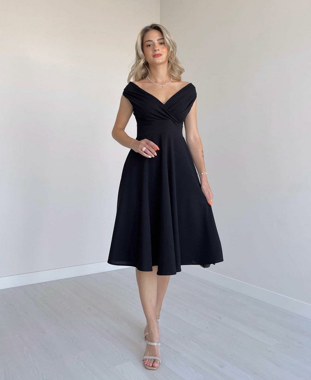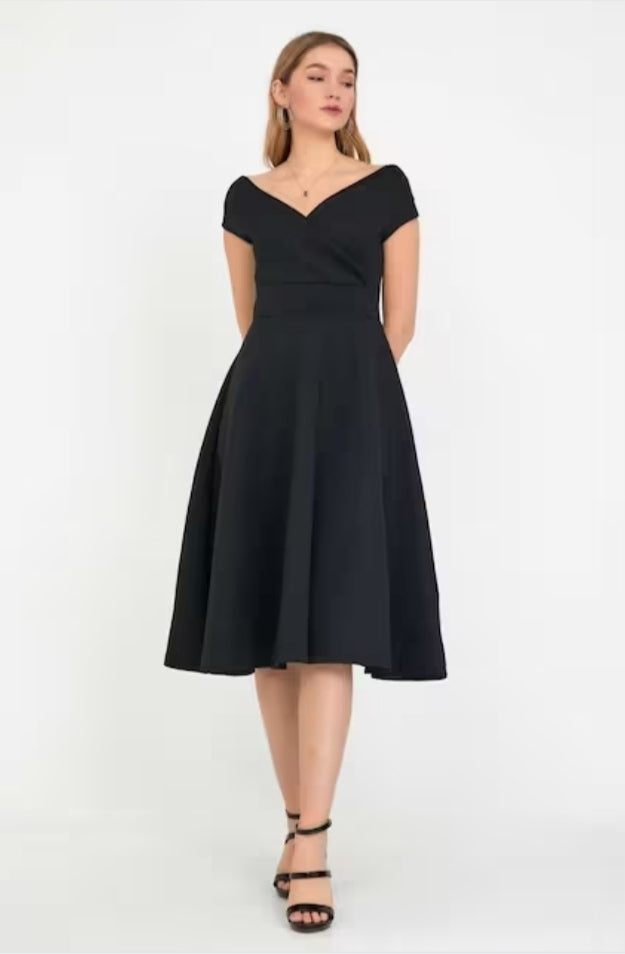 Kadın Kısa Kollu Kruvaze Yaka Eteği Volanlı Krep Elbise