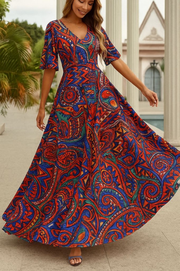 Kadın Kısa Kollu V Yakalı Desenli Süprem Elbise