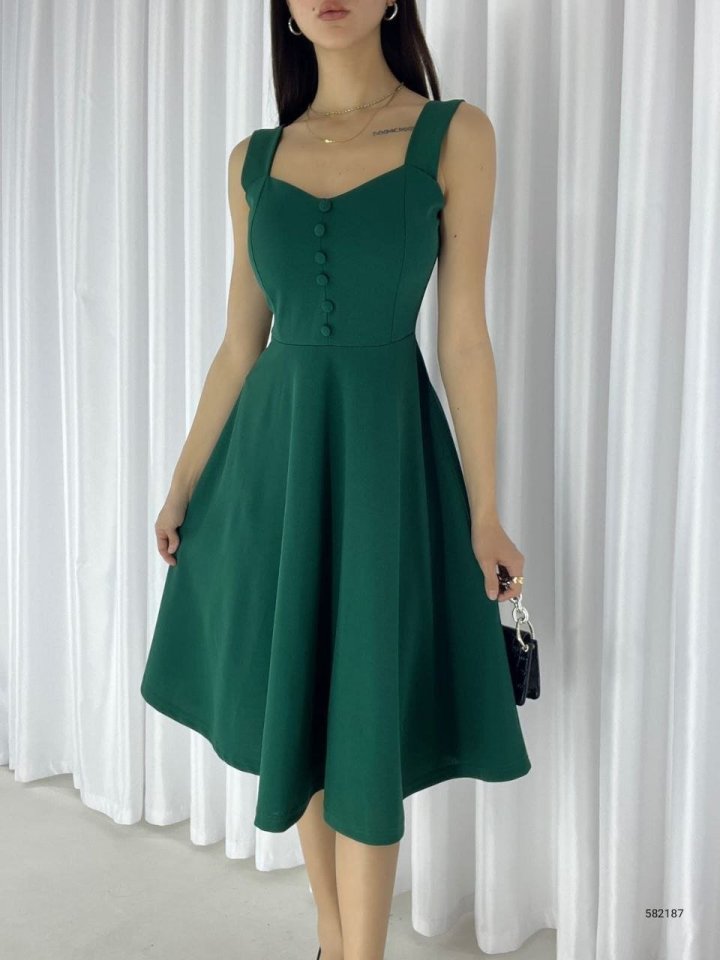 Kadın Krep Kumaş Askılı Kalp Yaka Düğme Detay Midi Boy Elbise