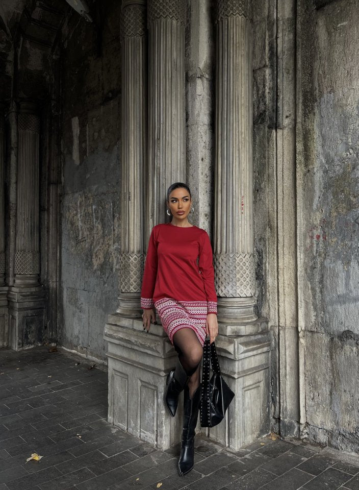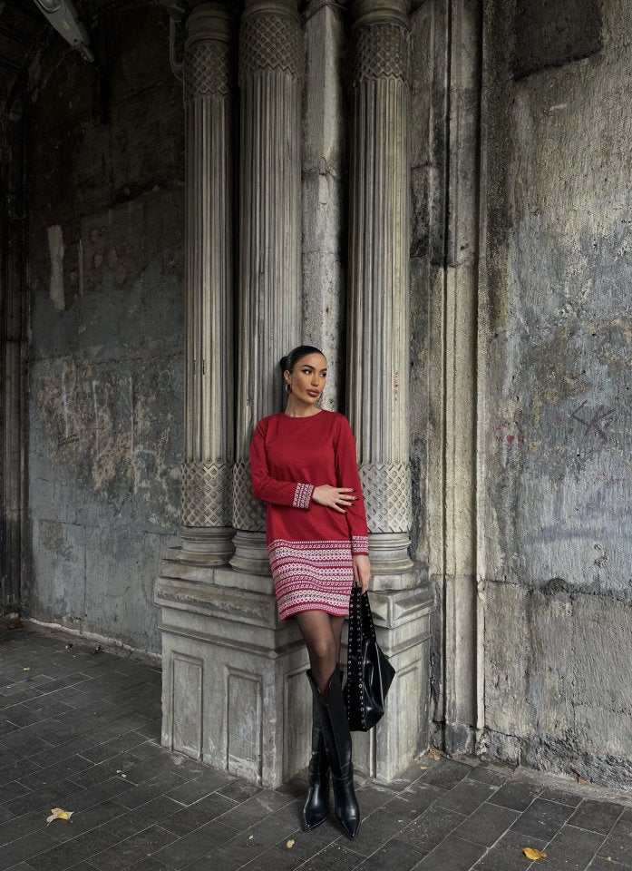 Kadın Uzun Kollu Bisiklet Yaka Kol Ağzı Ve Etek Ucu Baskılı Iki Iplik Elbise