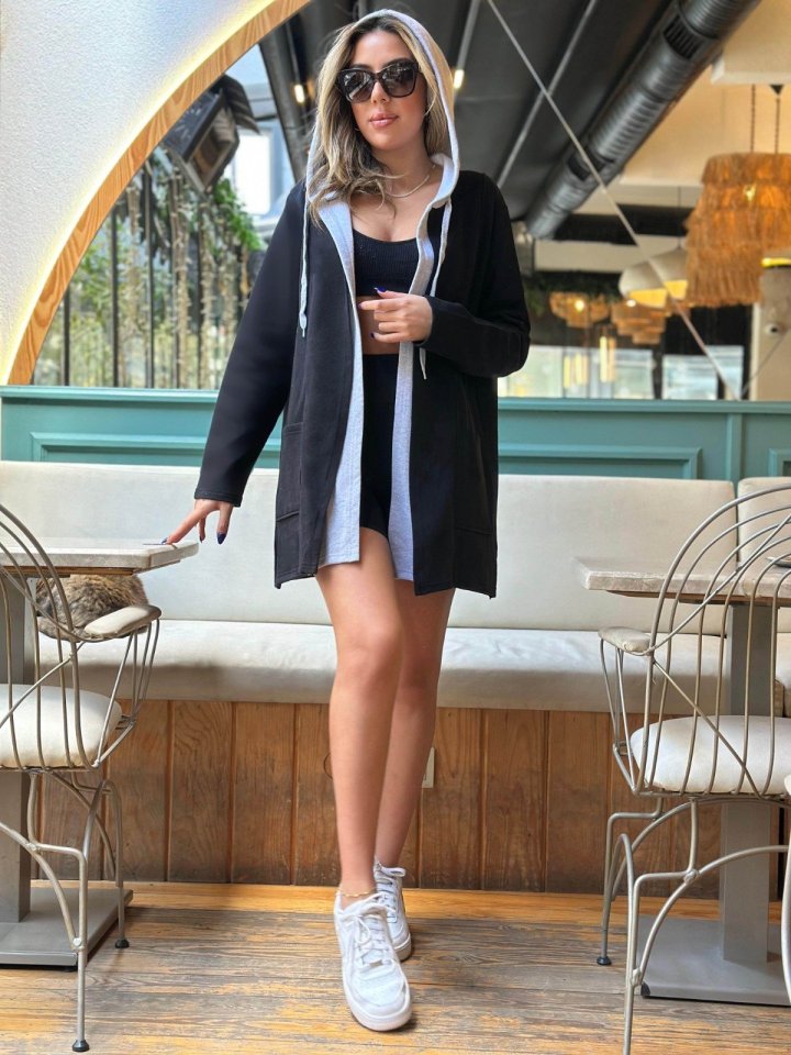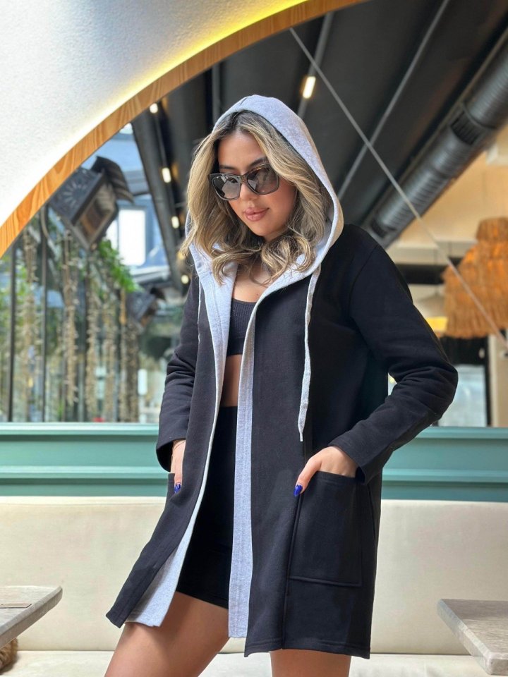 Kadın Uzun Kollu Kapşonlu Bağcıklı Cepli Iki Iplik Ceket