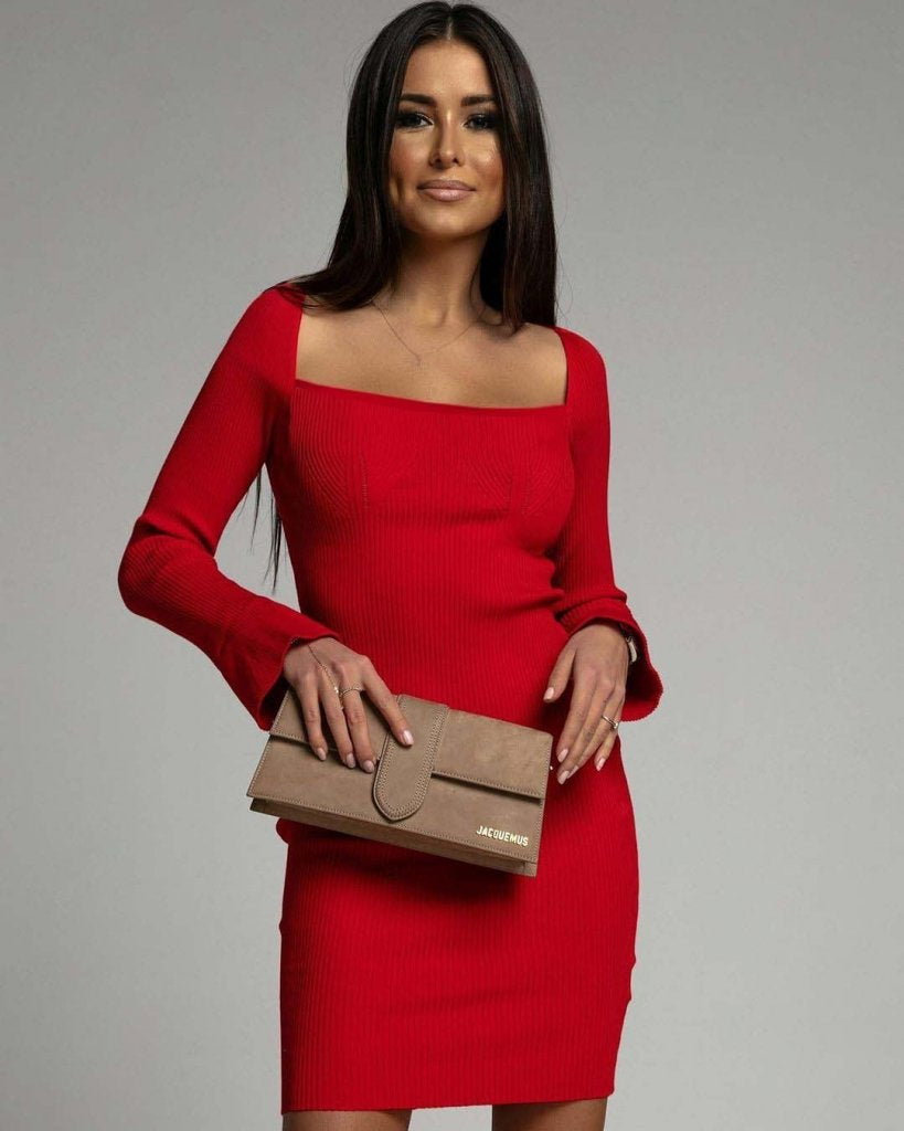 Kadın Uzun Kollu Kare Yaka Kol Ucu Ispanyol Triko Elbise