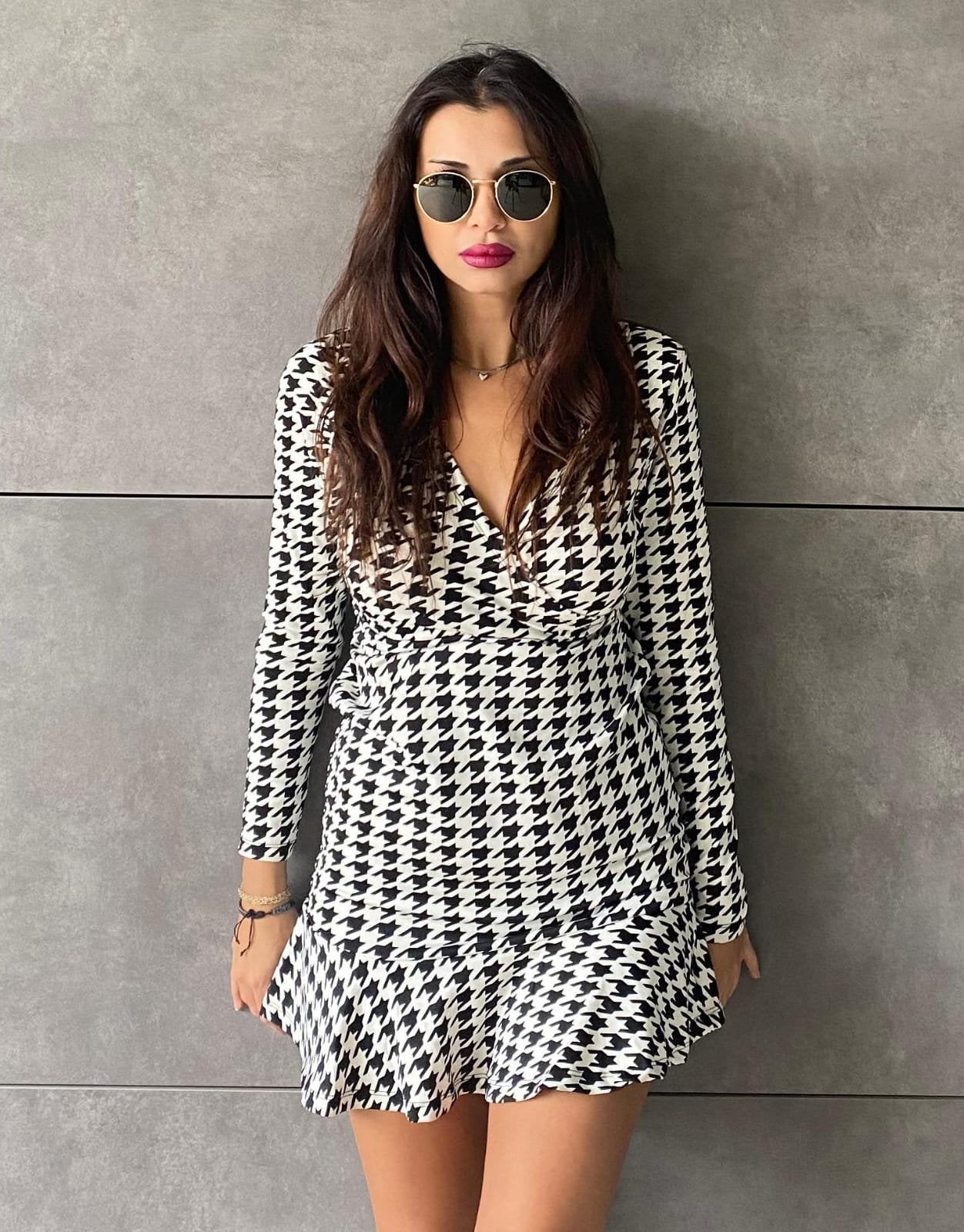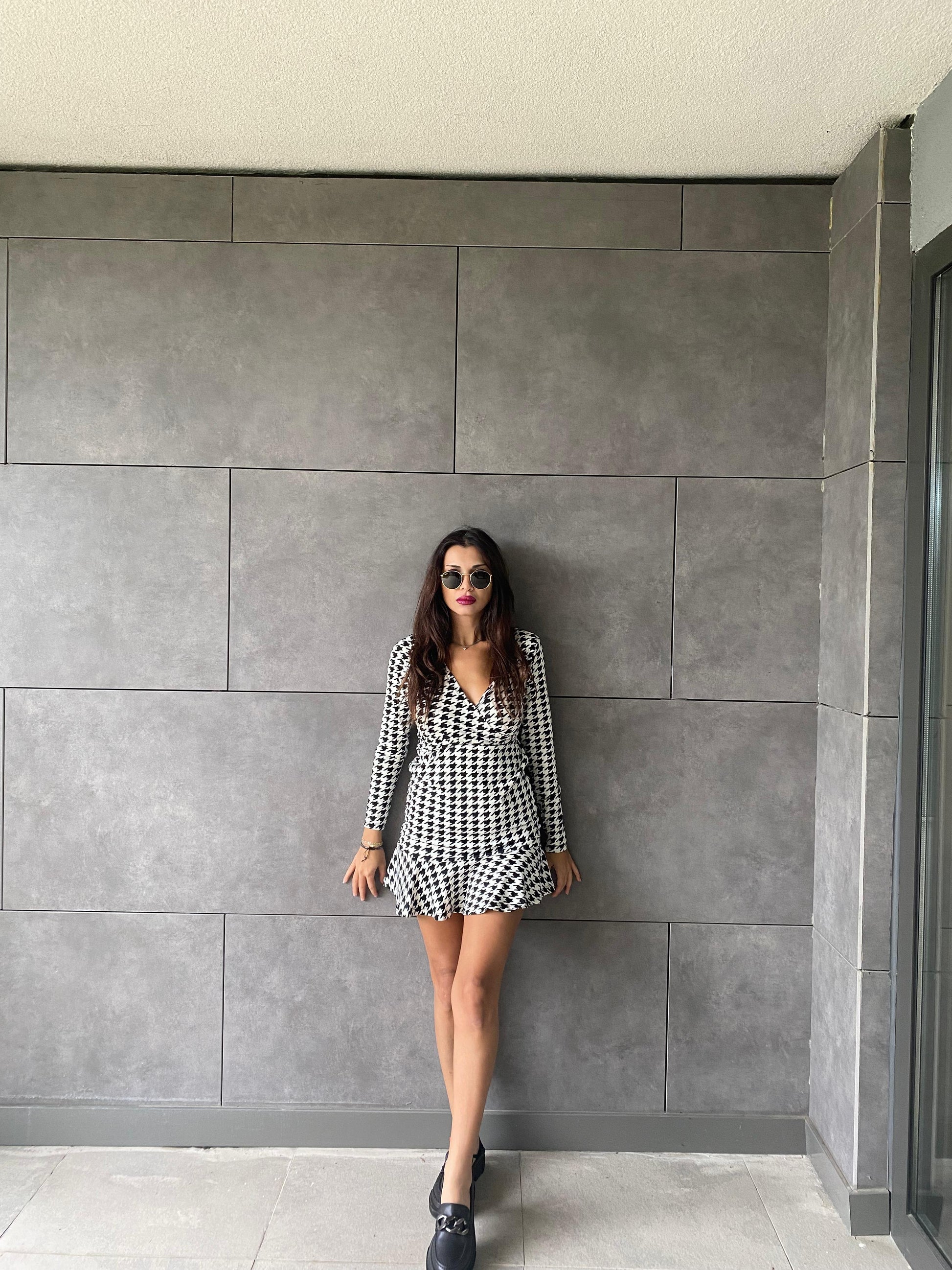 Kadın Uzun Kollu Kruvaze Yaka Kazayağı Mikro Mini Boy Elbise