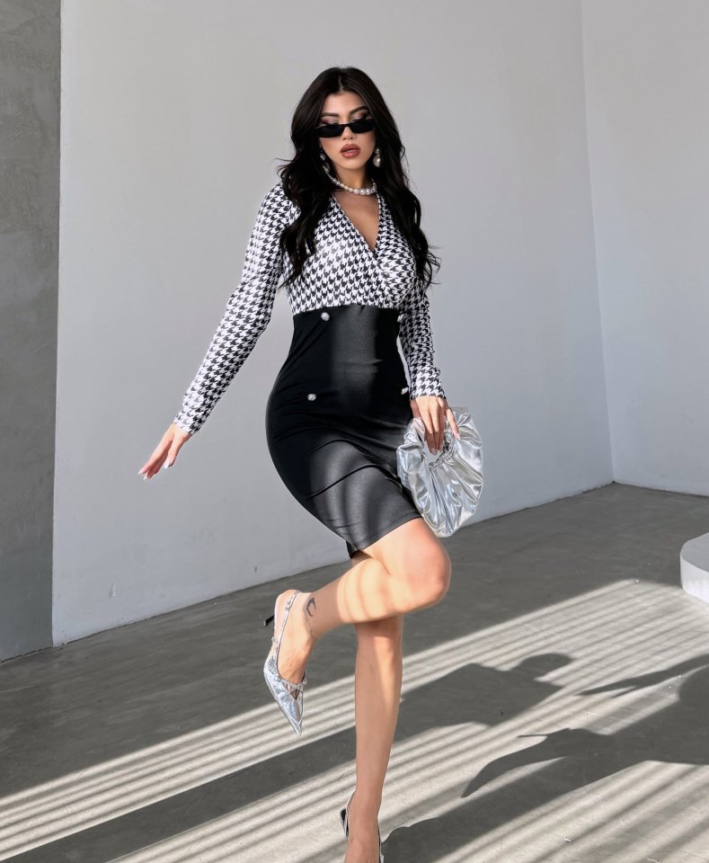 Kadın Uzun Kollu Kruvaze Yaka üst Kazayağı Desen Düğme Detaylı Dalgıç Elbise