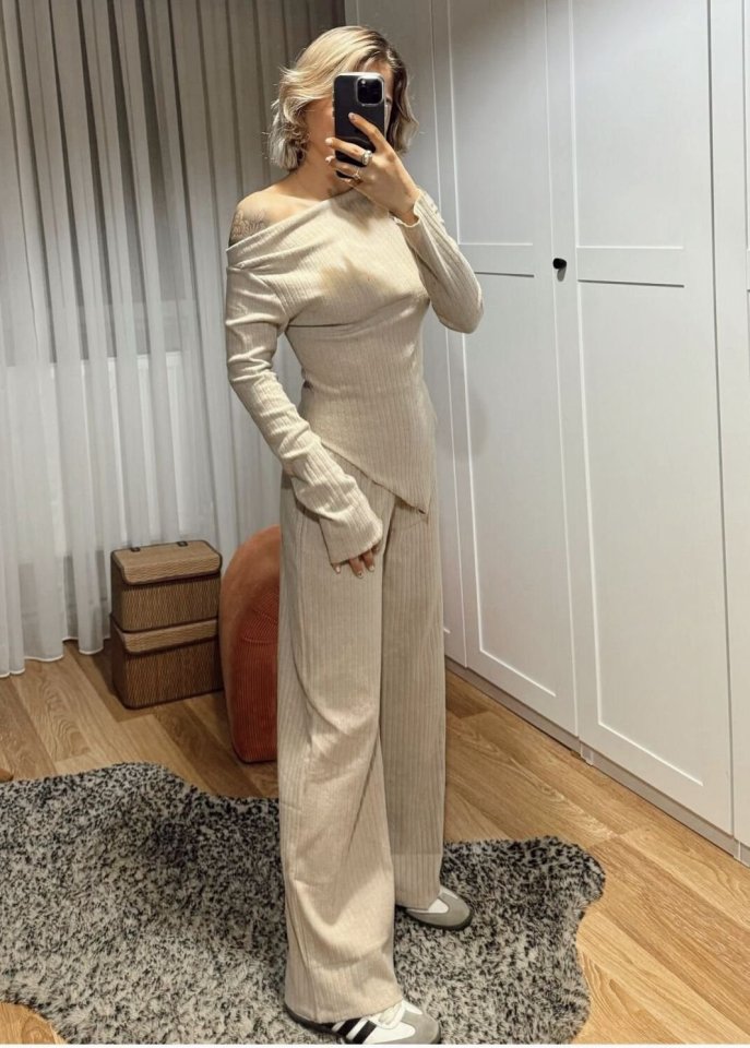 Kadın Uzun Kollu Omuzlardan Açık Asimetrik Kesim Kaşkorse Bluz Ve Pantolon Ikili Pantolon