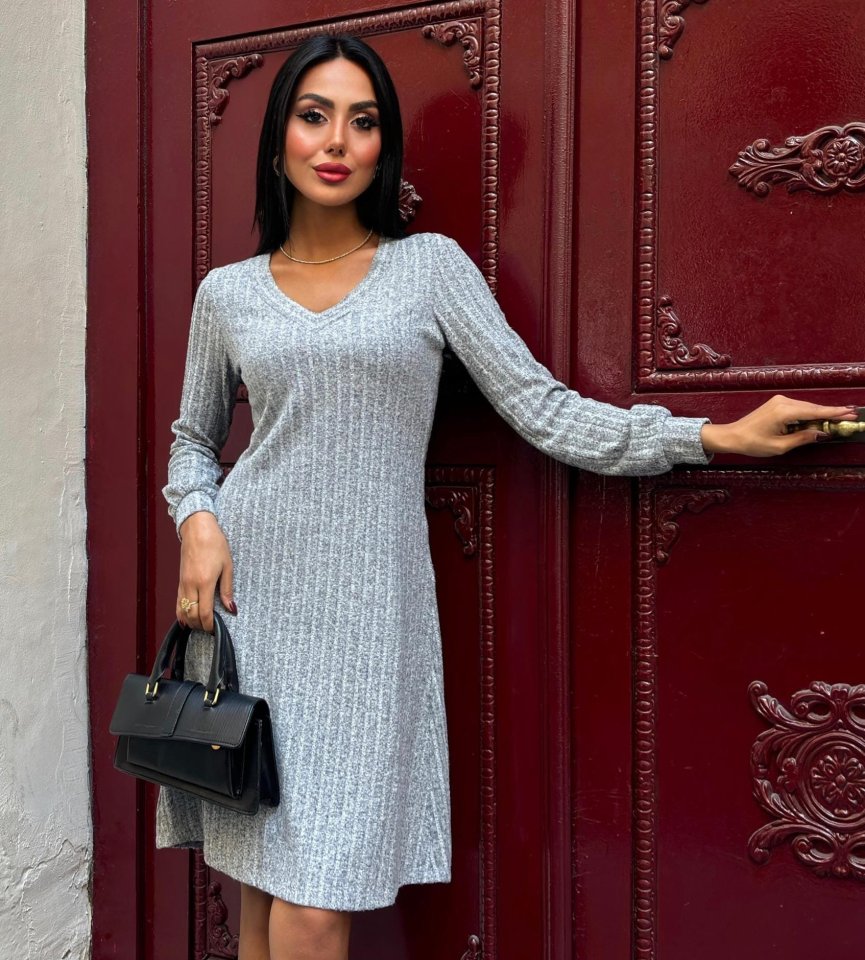 Kadın Uzun Kollu V Yaka Uzun Kol şardonlu Kaşkorse Midi Elbise