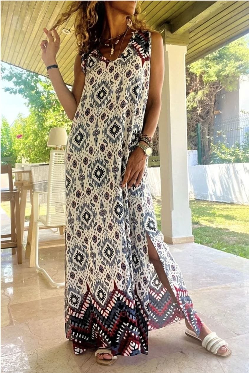 Kadın V Yaka Etnik Desen Baskılı Yırtmaç Detay Maxi Boy Elbise