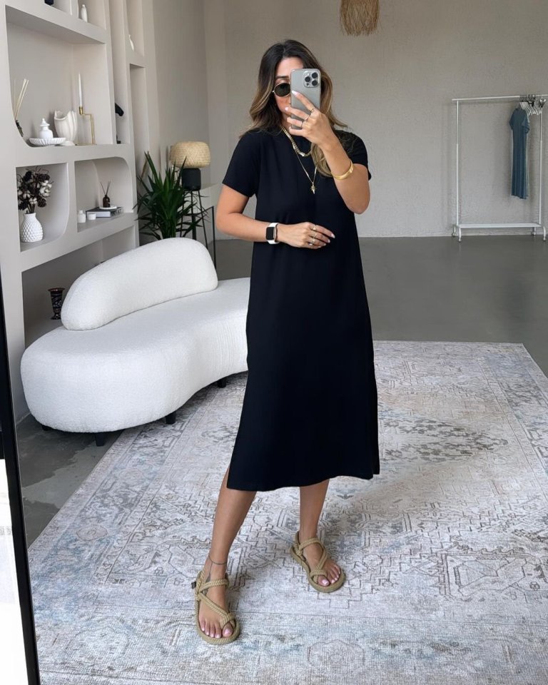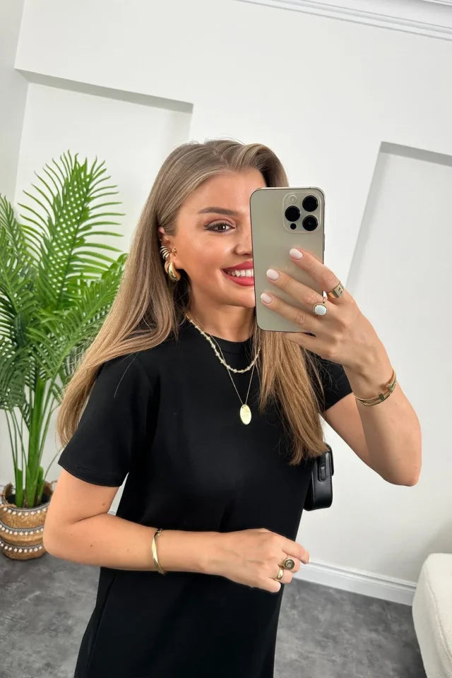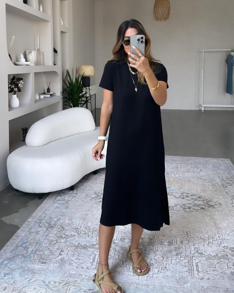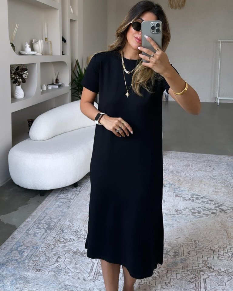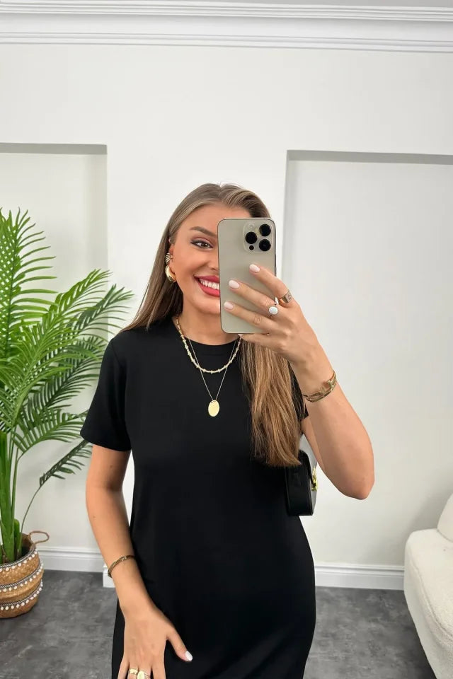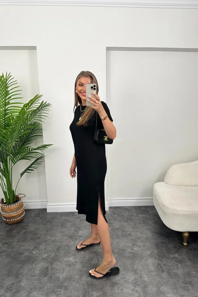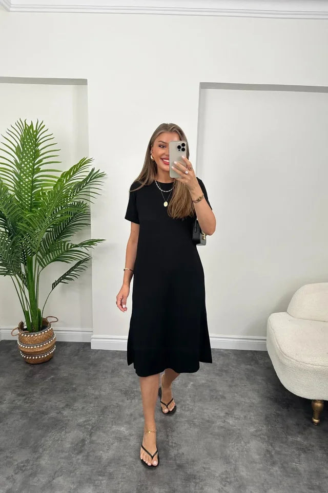 Kadın Viskon Kumaş Kısa Kollu çift Yırtmaç Detaylı Salaş Elbise
