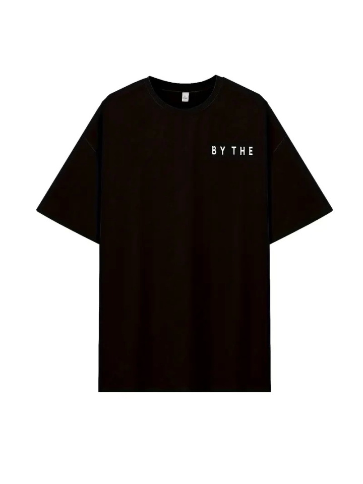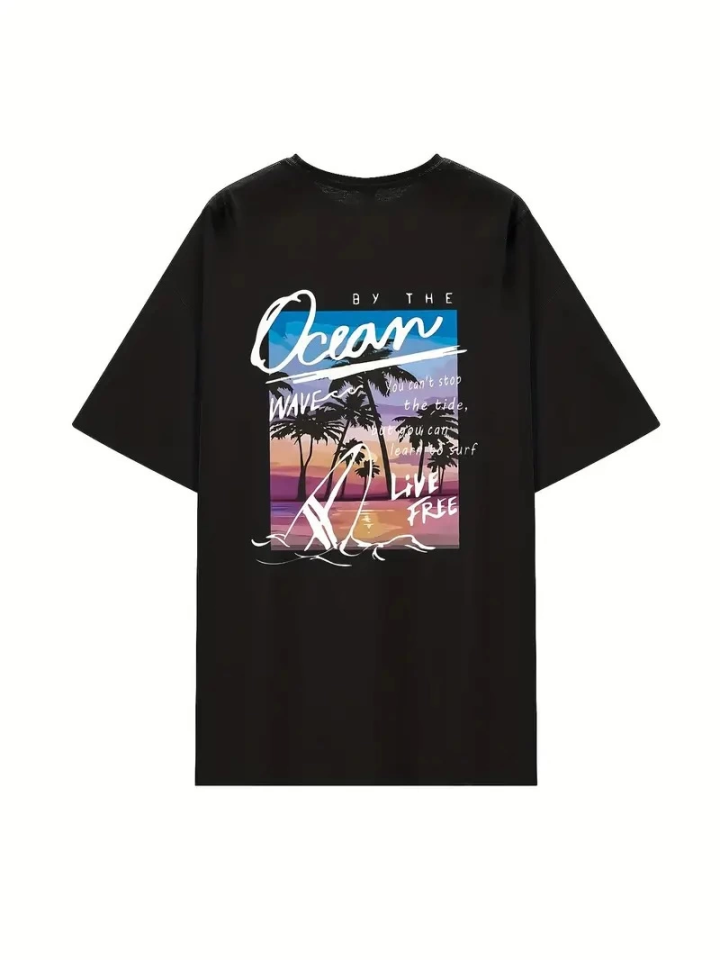 Kadınlar İçin Geniş Kesim Tişört - Kısa Kollu, Bol Kesim, Manzaralı Okyanus Baskı, Günlük Yazlık Üst, Siyah- Siyah
