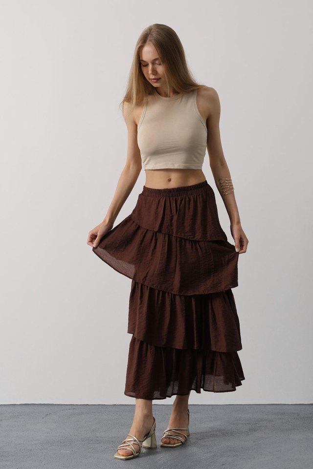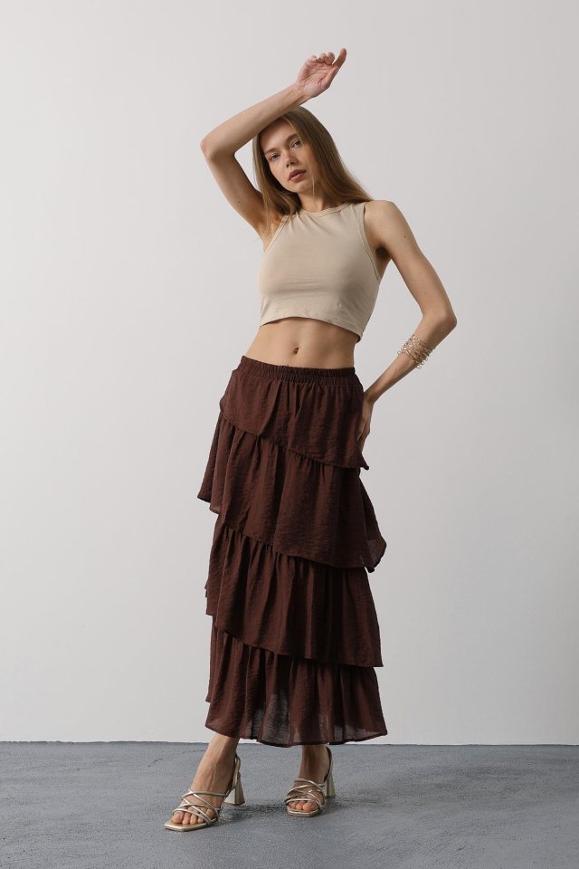 Katlı Kesim Uzun Etek - Kahve