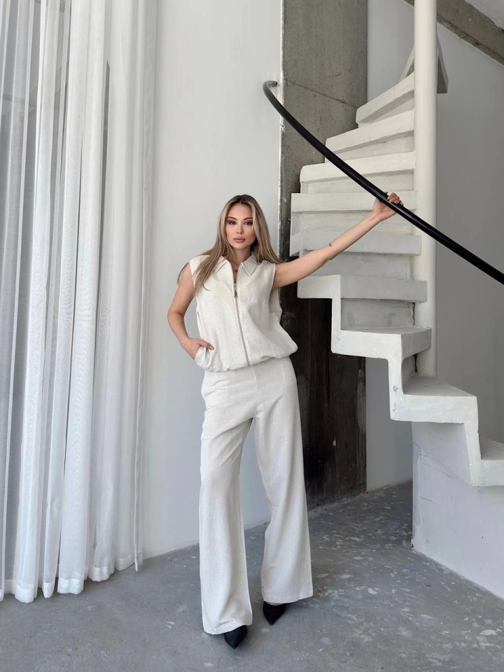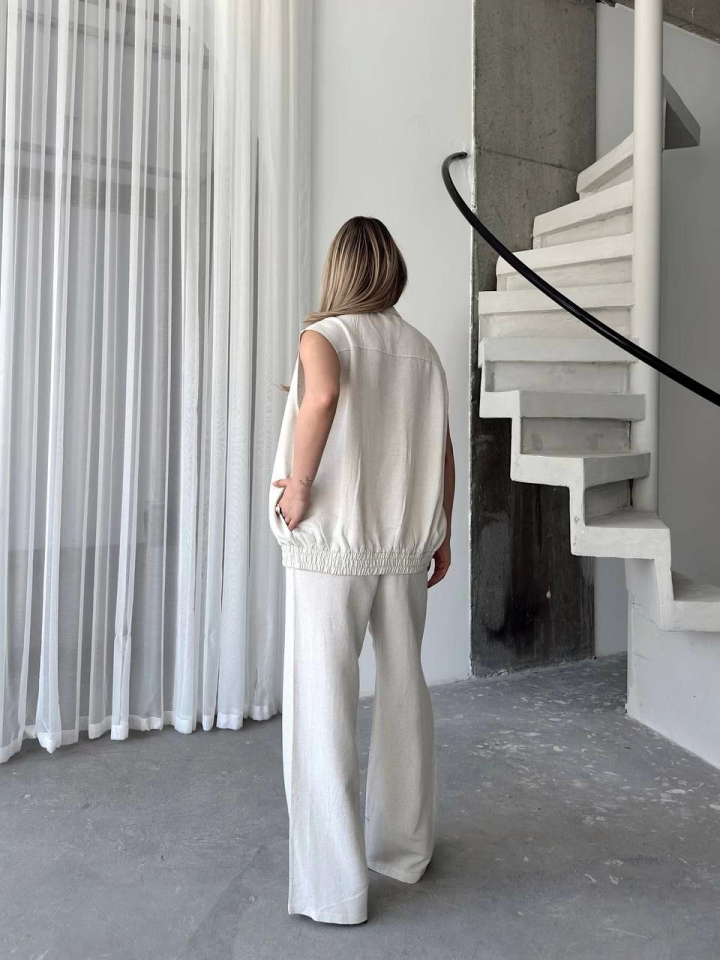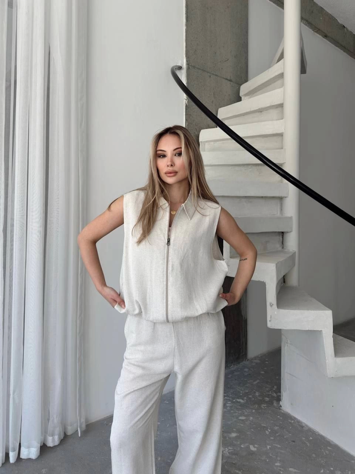Keten Tam Fermuarlı Kolsuz Ceket Pantolon Ikili Takım- Beyaz