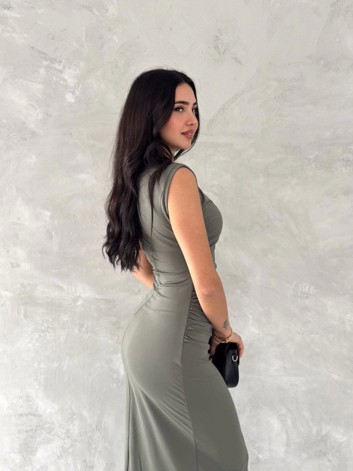 Kolsuz Yırtmaçlı Uzun Maxı Boy Elbise - Yeşil
