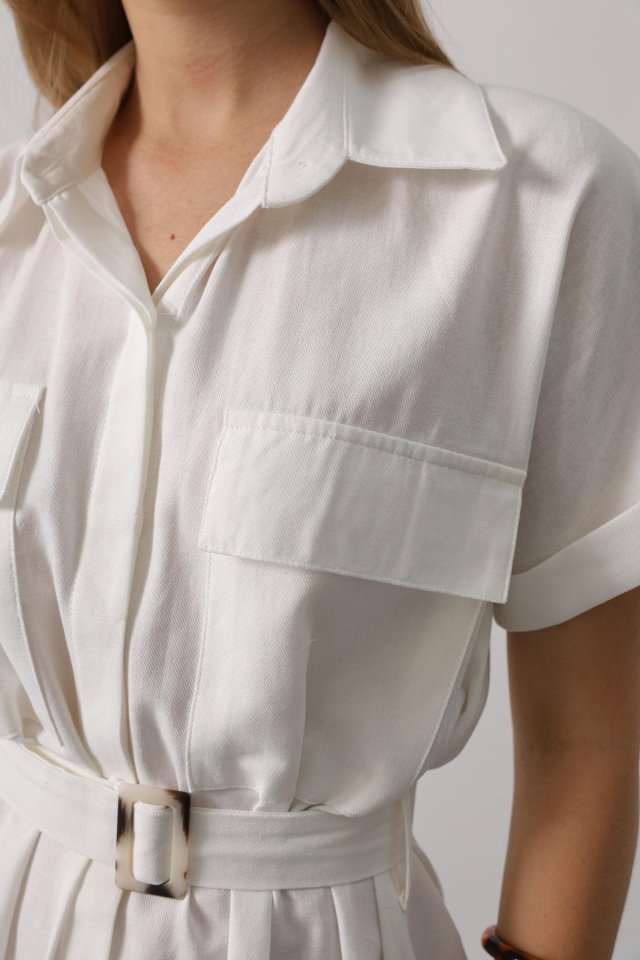 Kuşaklı Cep Detaylı Yarım Kol Elbise - Beyaz
