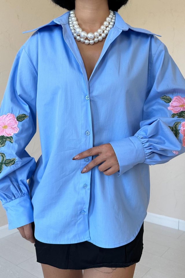 Mavi Kollarında Gül Nakışlı Gömlek