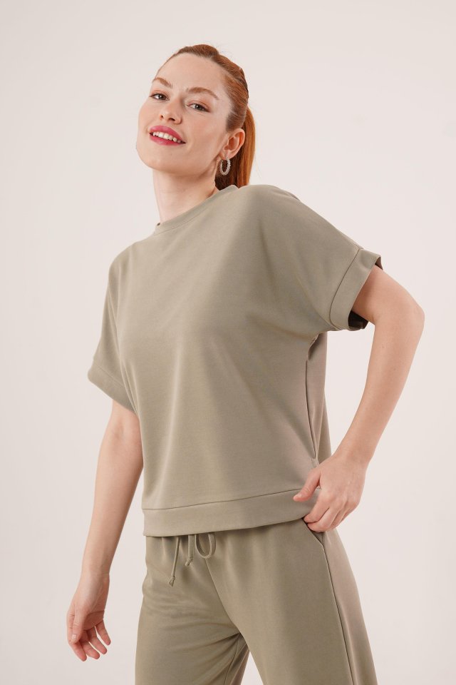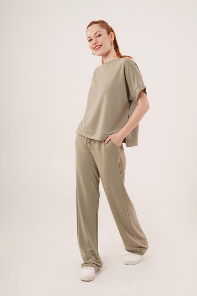 Modal Kısa Kollu Üst Ve Geniş Paça Eşofman İkili Yağ Yeşili Takım