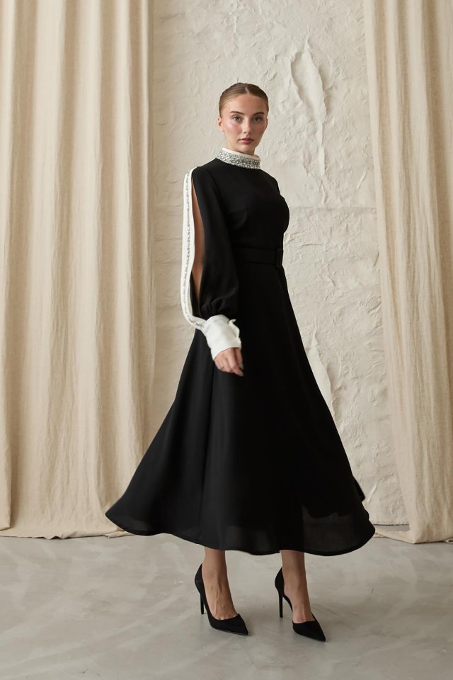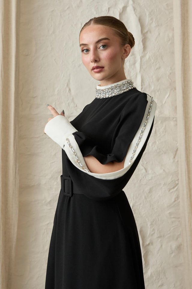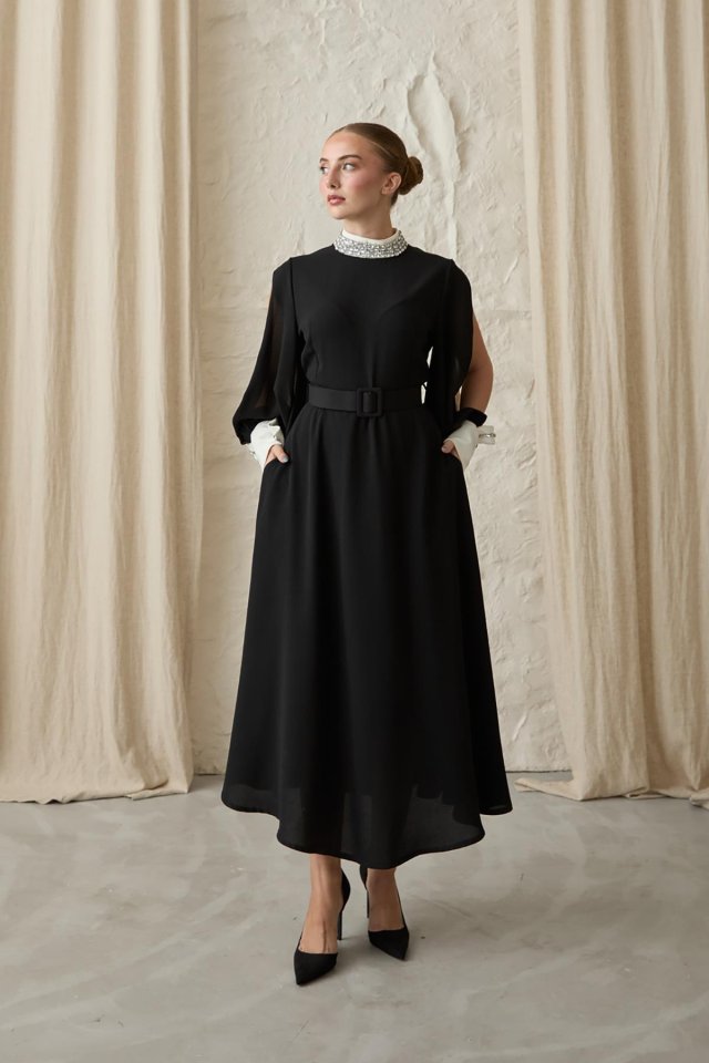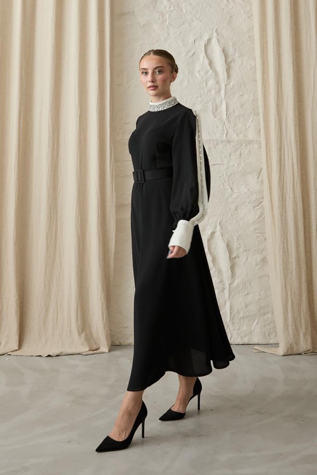 Siyah Yaka Ve Kolları Taşlı Elbise